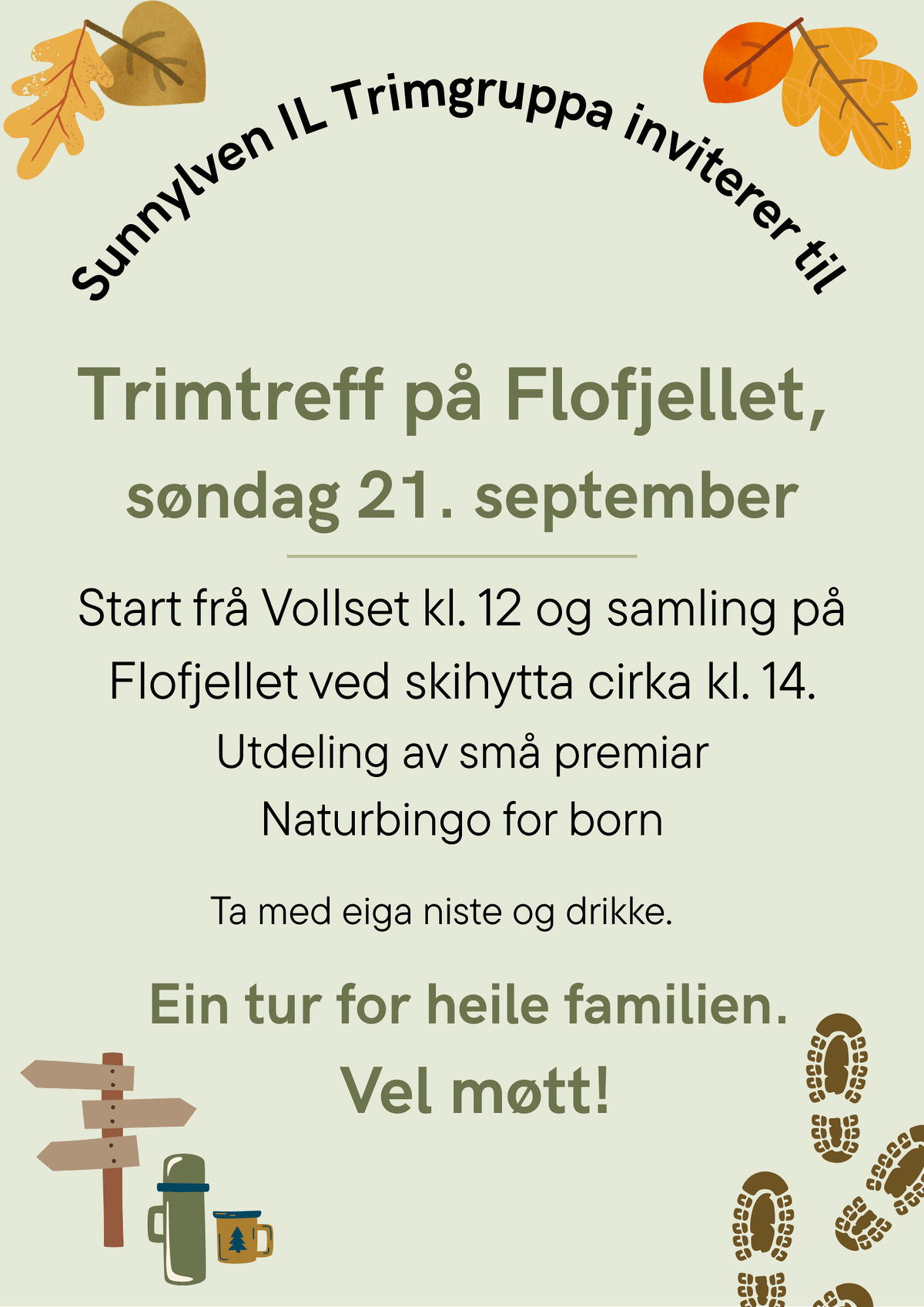 Velkomen til trimtreff på Flofjellet! Start frå Vollset kl. 12. Trekning av små premiar og naturbingo. For heile familien!